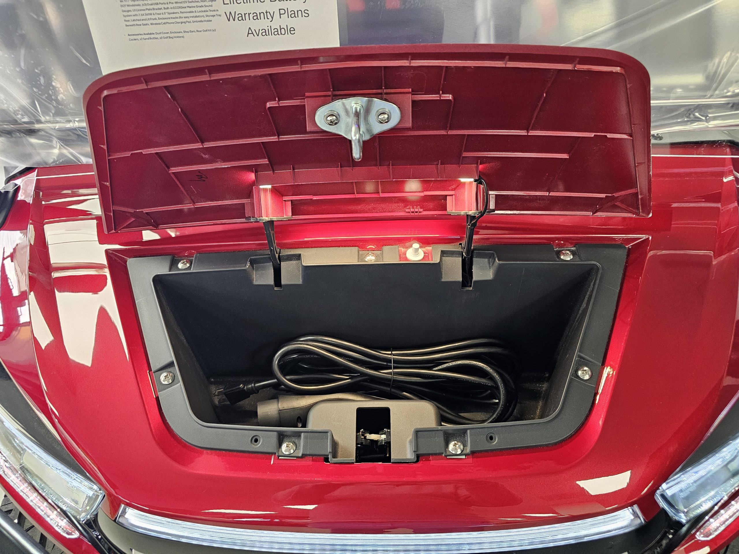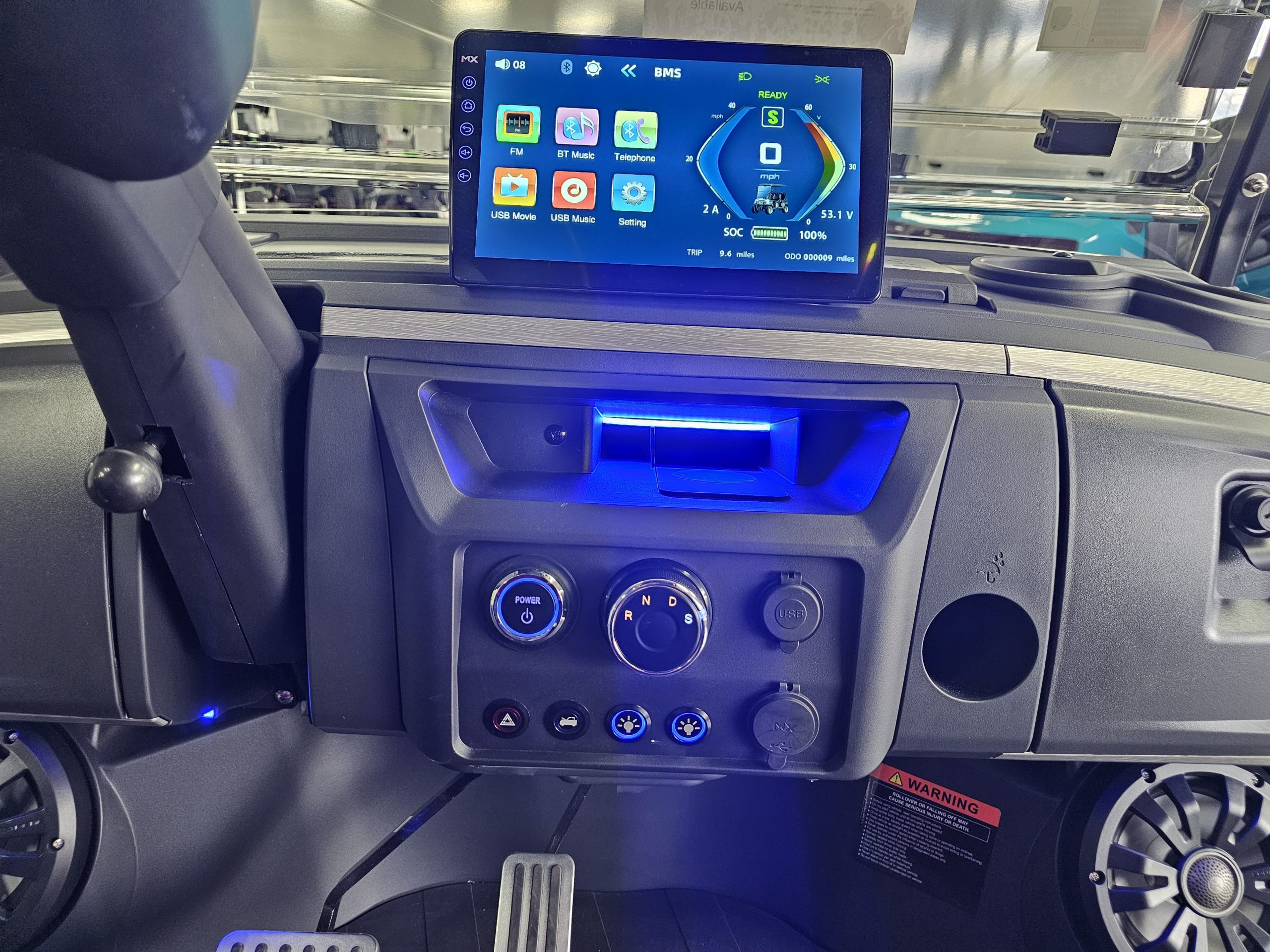 Dash & Infotainment: Locking Glove Compartments, 10.1” Digital Display Screen, Backup Camera, DOT Windshield, USB Ports & Pre-Wired 12v Switches, Horn, Digital Gauges, Lit License Plate Bracket, Built-in ECOXGear Marine Grade Sound System with 7.5A 360W Amp & Four 6.5” Speakers, Removable & Lockable Trunk in Rear, Latched and Lit Frunk, Storage Tray Beneath Rear Seats, Wireless Cell Phone Charging Pad, Tilt Steering, Horn in Steering Wheel, Umbrella Holder