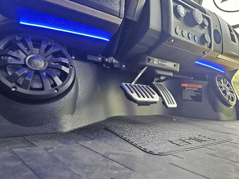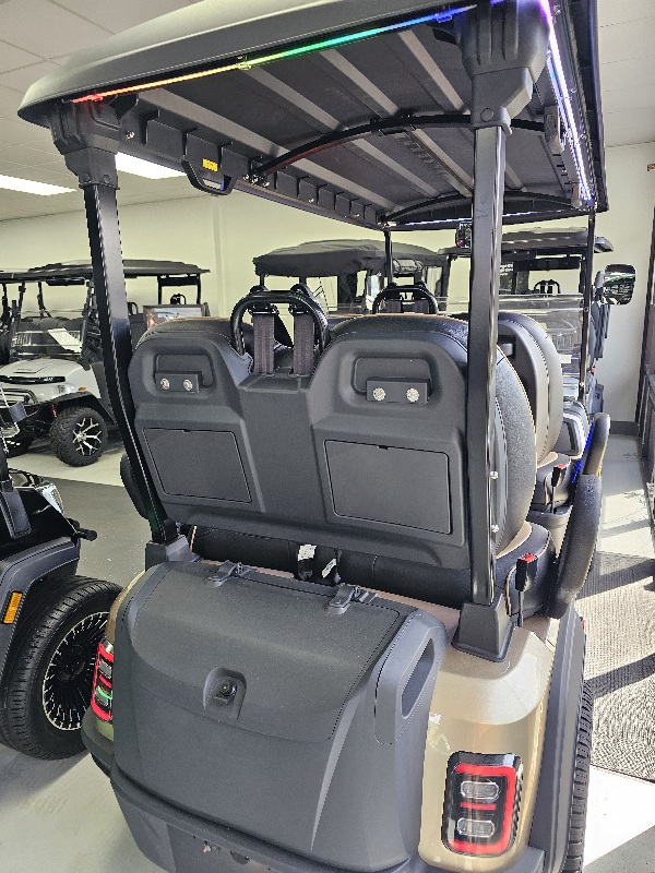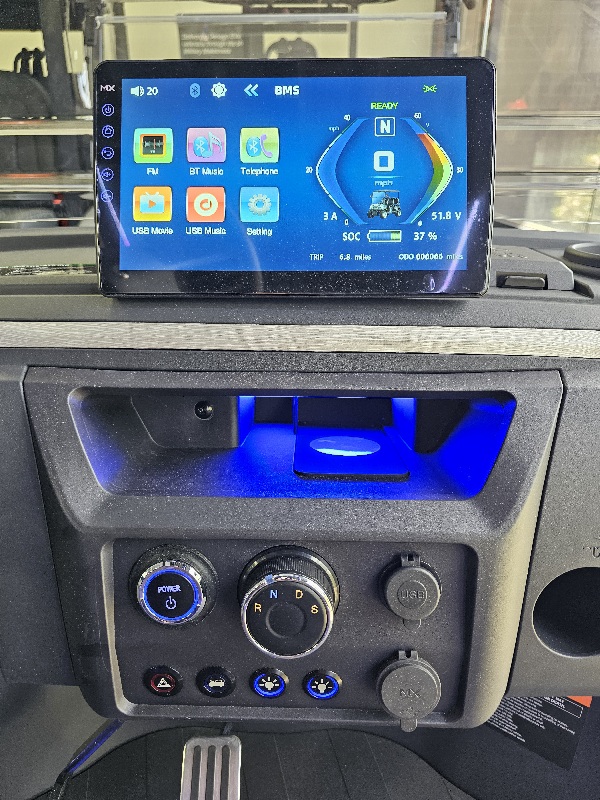 Dash & Infotainment: Locking Glove Compartments, 10.1” Digital Display Screen, Backup Camera, DOT Windshield, USB Ports & Pre-Wired 12v Switches, Horn, Digital Gauges, Lit License Plate Bracket, Built-in ECOXGear Marine Grade Sound System with 7.5A 360W Amp & Four 6.5” Speakers, Removable & Lockable Trunk in Rear, Latched and Lit Frunk, Storage Tray Beneath Rear Seats, Wireless Cell Phone Charging Pad, Tilt Steering, Horn in Steering Wheel, Umbrella Holder