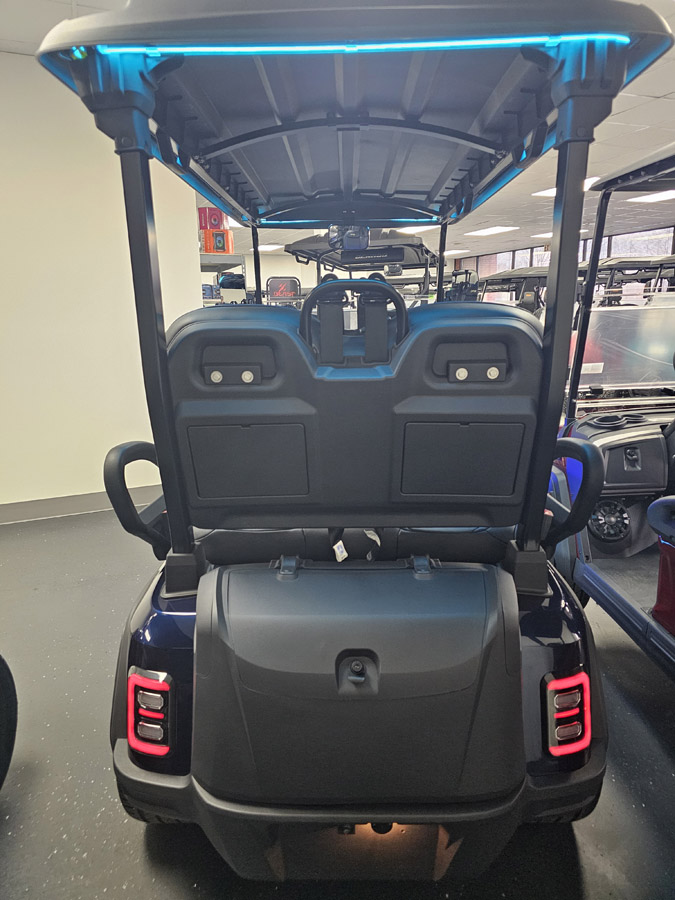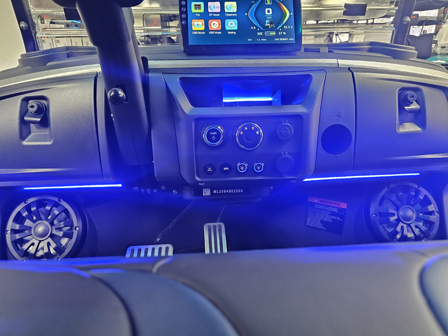 Dash & Infotainment: Locking Glove Compartments, 10.1” Digital Display Screen, Backup Camera, DOT Windshield, USB Ports & Pre-Wired 12v Switches, Horn, Digital Gauges, Lit License Plate Bracket, Built-in ECOXGear Marine Grade Sound System with 7.5A 360W Amp & Four 6.5” Speakers, Removable & Lockable Trunk in Rear, Latched and Lit Frunk, Storage Tray Beneath Rear Seats, Wireless Cell Phone Charging Pad, Tilt Steering, Horn in Steering Wheel, Umbrella Holder